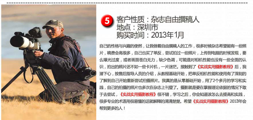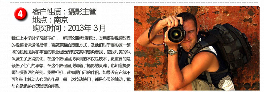 我们保证: 《史上最实用的摄影视频教程》是目前为止最新最全的教程,另外,我们还在不断的更新我们的教程,您将享受我们的终身免费升级服务,所以请您订购的时候留下您的QQ,一旦教程有更新我们都会发到您的QQ邮箱里,努力超越您的期待——就是我们最大的宗旨!!! |