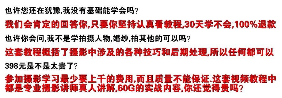 我们保证: 《史上最实用的摄影视频教程》是目前为止最新最全的教程,另外,我们还在不断的更新我们的教程,您将享受我们的终身免费升级服务,所以请您订购的时候留下您的QQ,一旦教程有更新我们都会发到您的QQ邮箱里,努力超越您的期待——就是我们最大的宗旨!!!